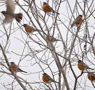 About 5 minutes after I saw the robins perch in their treetops, they all skedaddled. Following close behind was a hawk and odds are that huge flock was reduced by one.