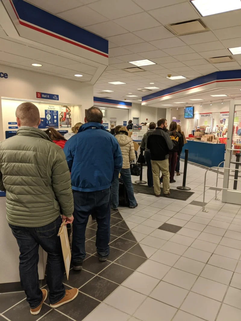 One of the two Post Office guys suddenly has to take care of a passport application, which will take him out of service for a week and a half. Now it’s the 14 of you in line waiting for a chance to see the one-and-only Post Office guy.