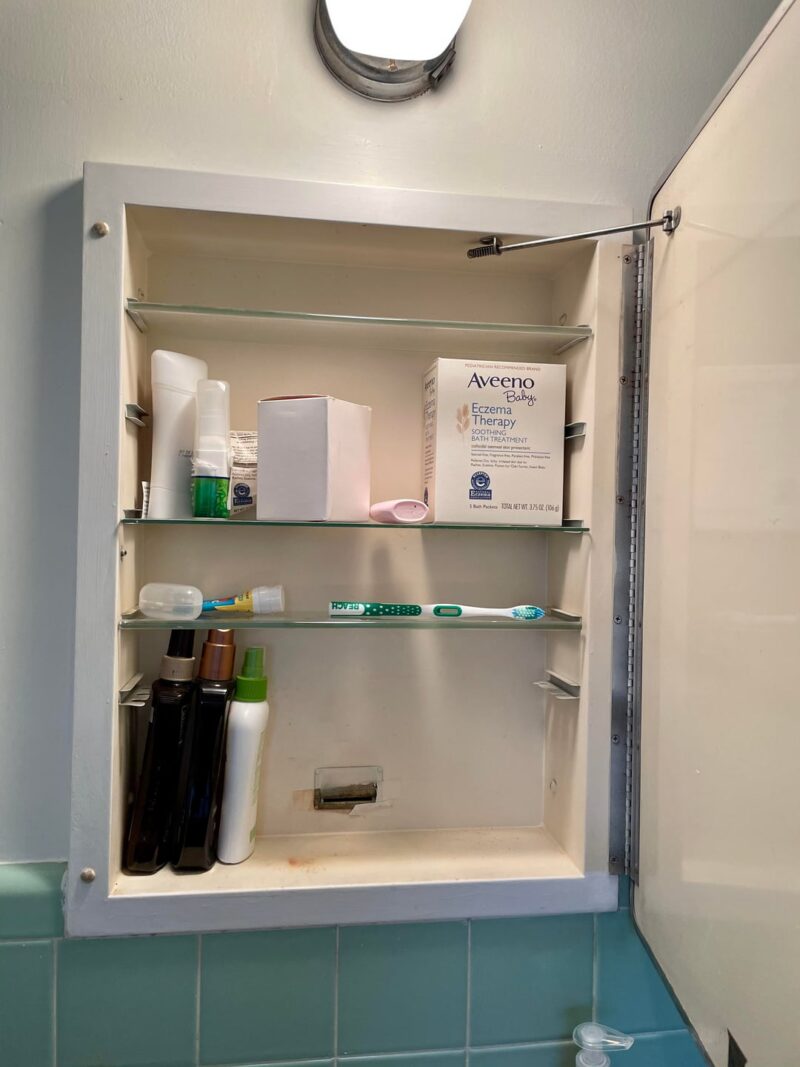 After a fellow named King C. Gillette came out with a safety razor that used thin, inexpensive, and disposable razor blades, the problem arose. Children were finding the blades in waste cans and trash collectors threatened to walk off the job. So between 1930 and the early 1970’s, cabinet makers put a compartment behind the backs of the medicine cabinets in which to simply drop the blades.