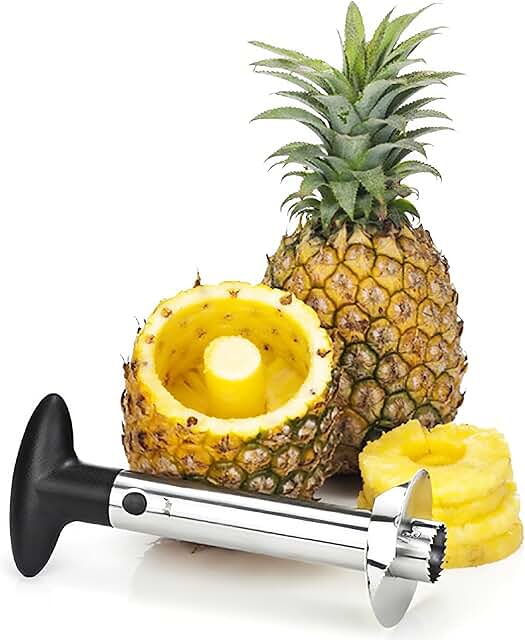 The only problem with pineapples is getting them out of their shells. I solved this problem years ago with the purchase of one of the handiest items in my kitchen. It’s a Pineapple Corer/Slicer. They are razor sharp, they are stainless steel and can go directly into a dishwasher and they work! They will slice and core a pineapple in seconds. They are only about $4 at Amazon – the same cost as one unripe cantaloupe.