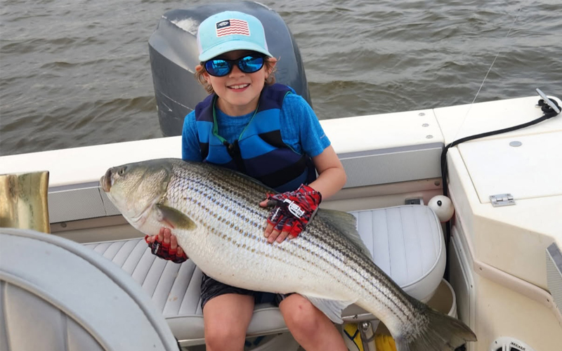 As they drifted downstream, suddenly, the rod belonging to Clark’s 8-year-old son, Mason, started screaming off the reel with a large striped bass on the hook. “Mason jumped on the rod, and it was way too big for him to try to take out of the rod holder, so he cranked on it, cranked on it, peeled off, and cranked on it some more, and finally got the fish to the boat,” Andrew said. “We netted it and did a quick picture, but we knew that it was probably a female, maybe breeding that time of year, so we made sure that we got it back in really quickly. We revived it a little bit, and it swam off nicely, so hopefully it survived the experience. We had a lot of fun!”