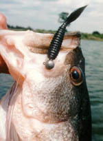 “Rigging is simple. I use ¼ ounce ball head jigs made with Mustad Ultra Point hooks Paint heads black with spray paint. Thread a Stingray with the tail flat. Here’s an important tip. Keep grubs, soaked in garlic Jack’s Juice Bait Spray, in your pocket to keep them warm. It makes the plastic more pliable and won’t split when putting on the hook. A dab of Pro’s Soft Bait glue is all that’s needed to fish these until you get hung up.”