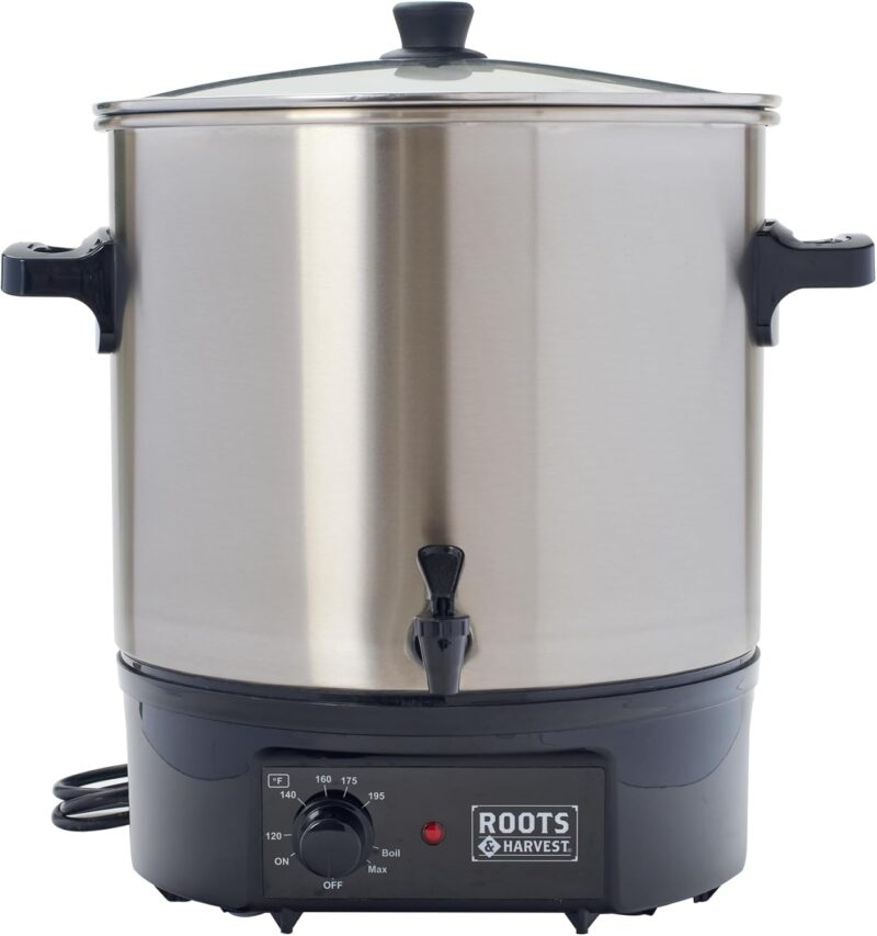 As it turned out, she loved the canner and uses it often throughout the summer. Ours is a Roots & Harvest Electric Bath Canner with a Stainless-Steel Pot and Glass Lid. It has a 27-liter capacity and can accommodate up to 8 quart, 11 pint or 14 jelly jars. So, she can usually get the job done in one easy step.