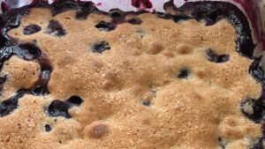 The secret to any dessert or sweet is butter, lots of butter, so I begin my recipe by melting a stick and a half of butter in a casserole dish in the microwave. Next, mix 1 3/4 cups of Bisquick mix with ¾ cup of sugar and stir with a whisk. When blended, add 1 cup of whole milk. Stir out all the lumps, then pour the mixture directly on the melted butter. Don’t mix the butter and the mixture. It will all work out in the end. Finally, add 4 full cups of fresh blueberries on top.