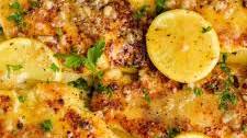 In a bowl, combine 1 egg with 2 T dry white wine, 2 T lemon juice, 1 minced garlic clove and a dash or two of red pepper sauce. In a separate bowl, combine ½ C flour, ½ C grated parmesan cheese, 1 t dry parsley (or ¼ C fresh if you have it) and ½ t salt. Coat the chicken with flour mixture, dip in the egg wash, then coat again in the flour. Brown the chicken breast portions in 1½ t olive oil for 4 to 5 minutes per side (until golden brown) flip and repeat. Remove and keep warm. In the same pan, add 1 ½ T olive oil melt 2 T butter, 2 T lemon juice, 2 T wine. Bring sauce to a boil and reduce by about half, then drizzle the sauce over the chicken and serve. Bon Appetit!