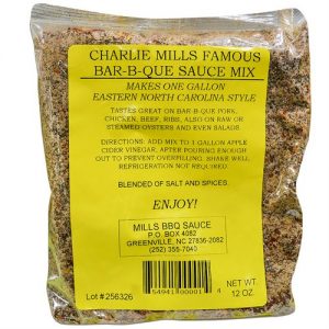 Charlie Mills has developed an Eastern North Carolina Bar-B-Que Sauce Mix that is the best. All you need do is to add a couple tablespoons of the mix to a 16-ox jar of cider vinegar and water – about three to one in ratio. Shake it up, douse it on the pulled pork and “pig out!”