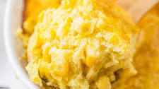 Put a bag of frozen corn in a mixing bowl along with 5 beaten eggs, a cup of sugar, 1 t vanilla, 1 t salt, 1 C sugar and – yes – one large can of evaporated milk. Mix it all together, put it in a well-greased casserole dish and bake in a 350-degree oven for about 40 or 45 minutes, or until it turns golden brown. Be sure to put a cookie pan beneath the casserole dish, as it sometimes bubbles over.