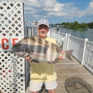 On May 30, 2022, Randy Morton was fishing at the Chesapeake Bay Bridge Tunnel when he landed a 9-pound, 2-ounce sheepshead on 8 lb. test line, it was a potential world record for that class. This year Randy is back with a 13-pound 7 oz Sheepshead pictured above. Monster sheepshead are now being caught routinely at the CBBT and on other bay structures. They go for fiddler crabs and are considered one of the finest eating fish of all.