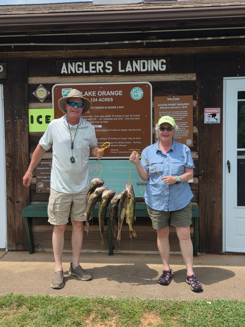 The picture above confirms the success of the Department Fisheries experts as knowledgeable fisherman are using harness rigs baited with live crawlers to entice strikes and catch limits. At Lake Orange, you might catch a cooler of big bluegills, you might come home with a long stringer of crappie, perhaps some fat channel cats or maybe even a largemouth bass over 10 pounds. And, yes, walleye, too.