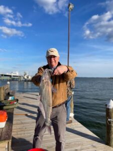 There are lots of fish that could bite in Urbanna Creek at the mouth of the Rappahannock River – stripers, trout, puppy drum, and white perch – to name a few, but they didn’t like what I was cooking for dinner. So, there I sat, bite-less. I had been throwing grubs and Ratt’l Traps and dunking Fishbites off the docks, but no takers. As long as I was just going to sit there, I went to the old reliable – shrimp. I put a couple pieces on a double drop rig, tossed the bait out, put the rod in a holder and sat back to smoke a cigar.