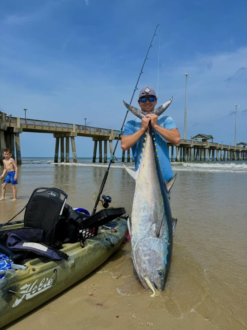 Stefan Turko was in Kitty Hawk and could see tuna boiling in the water just offshore. Several anglers had lost tuna while fishing on Jennette’s Pier, so Turko shoved off in his kayak and hooked up – four times. The first three broke off but the 4th fish stayed on the line long enough for Turko to tire it out and haul it up on the beach to the amazement of dozens of spectators.