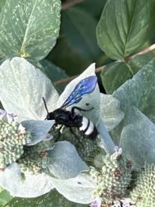 The black and white bee with purple wings is actually a wasp – a Mason Wasp. They are found in the Eastern part of the United States in mid- to late summer, a frequent visitor to nectar producing plants such as goldenrods, snakeroots, and mountain mint. The striped wasps are solitary creatures and build mud chambers where they stuff their kill – caterpillars, spiders, and the like. They also lay an egg in each chamber which pupates and later becomes an adult wasp.